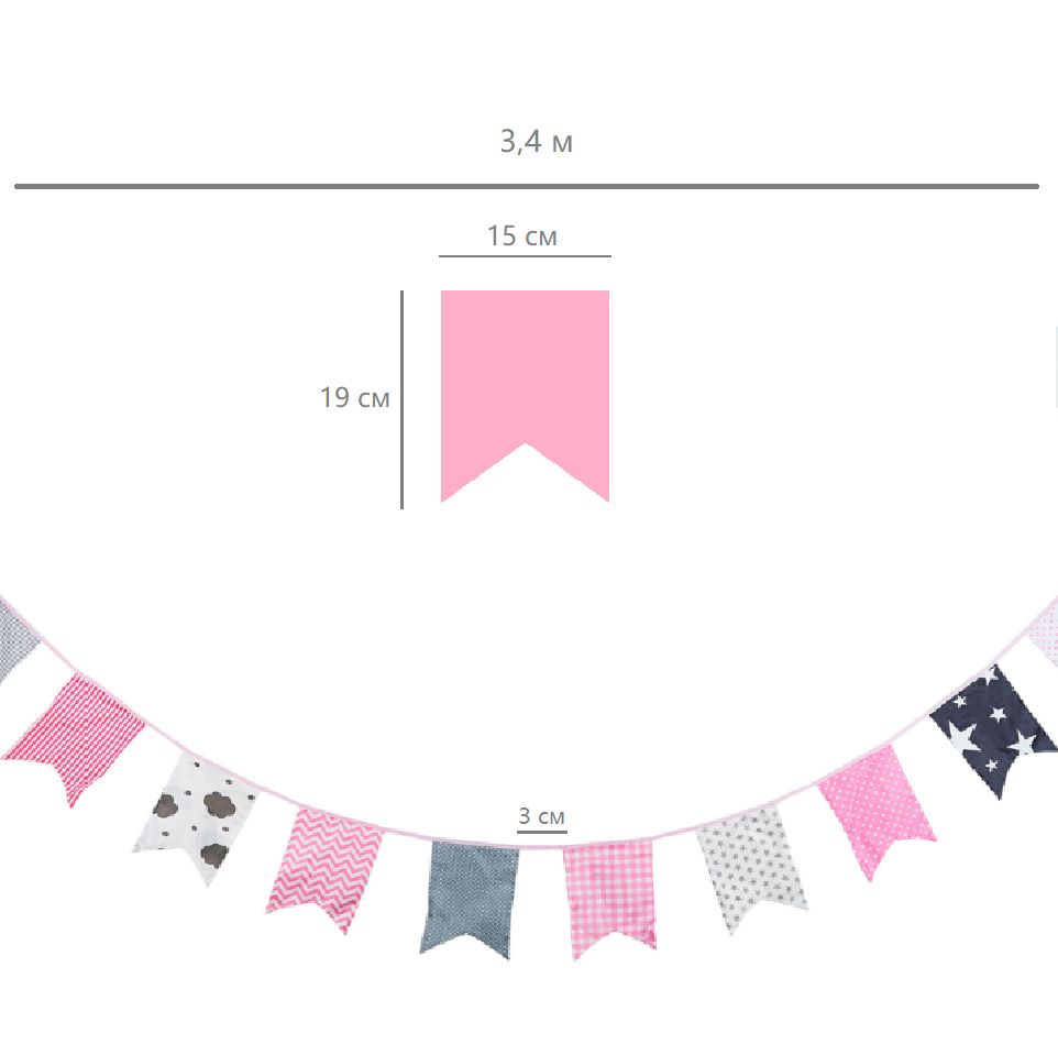 Гирлянда состоит из 12 флажков, общая длина составляет 3,4 м, расстояние между флажками 3 см, длина матерчатых флажков 2,1 м, длина лямок с обеих сторон по 50 см