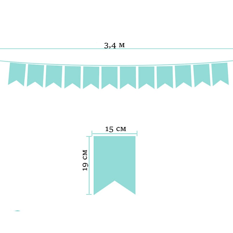 Гирлянда состоит из 12 флажков, общая длина составляет 3,4 м, расстояние между флажками 3 см, длина матерчатых флажков 2,1 м, длина лямок с обеих сторон по 50 см