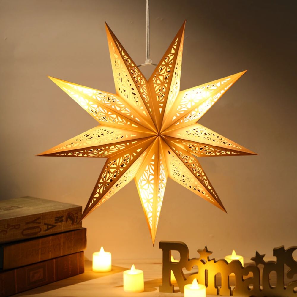 Имеет 9 лучей и встроенный шнурок для подвеса. Доставляется в сложенном виде, легко приводится в рабочее состояние. Для сборки предусмотрен шнурок, который при затягивании формирует объемную фигуру и надежно фиксирует ее форму. После сборки изделие сохраняет стабильную конструкцию без дополнительных креплений, можно использовать неоднократно.